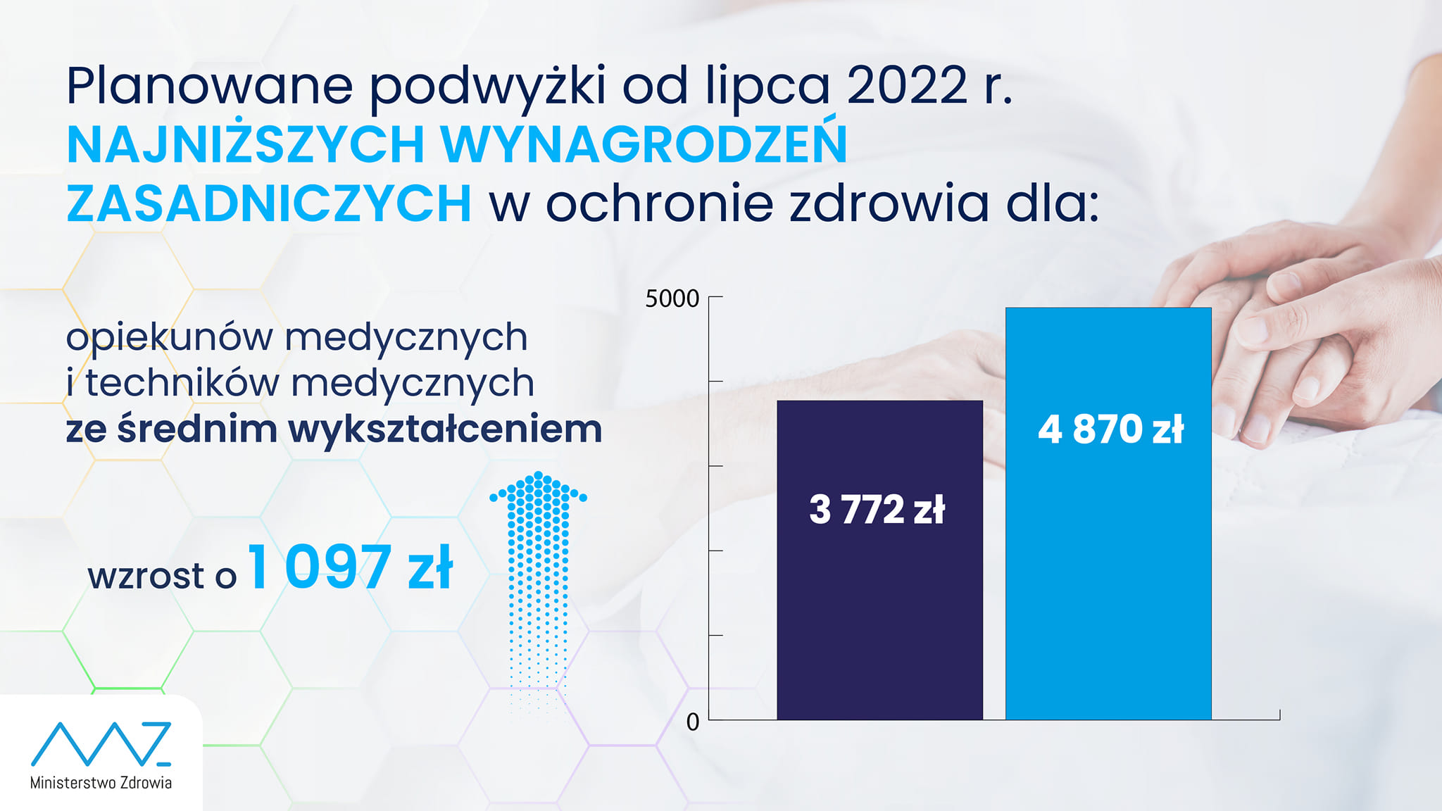 - Opiekun medyczny, technik medyczny ze średnim wykształceniem: z 3 772 zł do 4 870 zł – wzrost o 1 097 zł,
